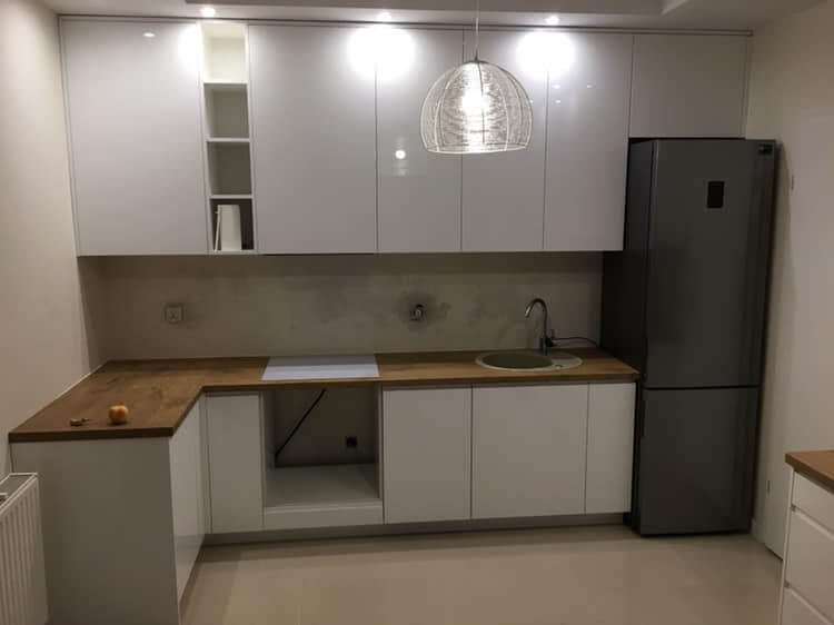 Stylowa kuchnia z frontami w białym połysku, które idealnie kontrastują z ciepłym, drewnopodobnym blatem laminatowym.